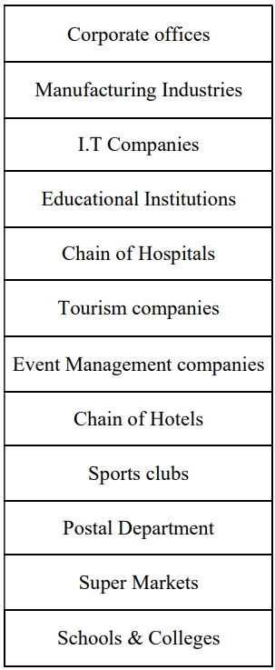 Corporate offices | Manufacturing Industries | I.T Companies | Educational Institutions | Chain of Hospitals | Tourism companies | Event Management companies | Chain of Hotels | Sports clubs | Postal Department | Super Markets | Schools & Colleges